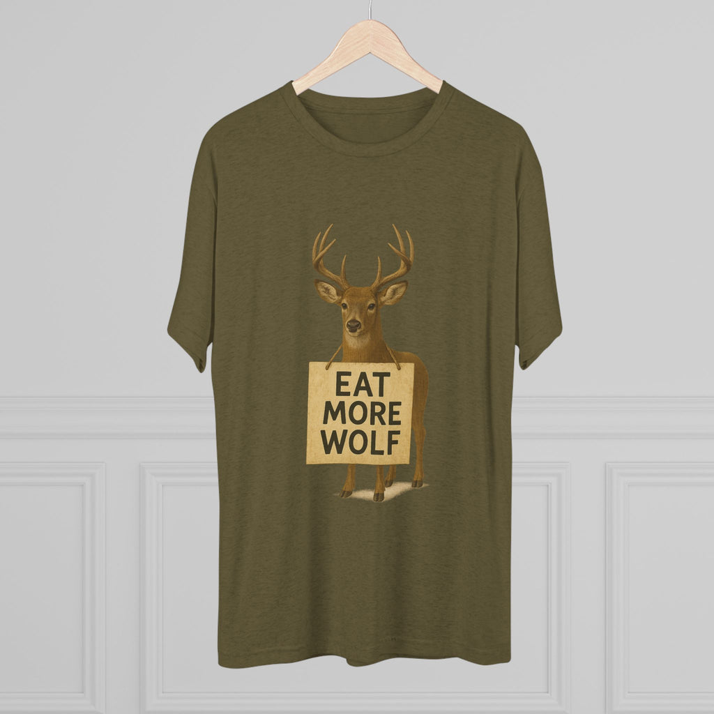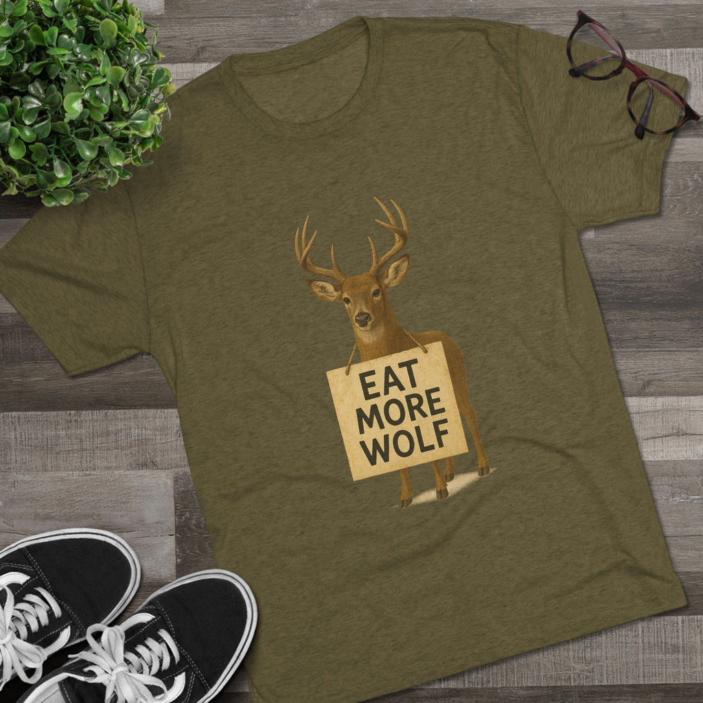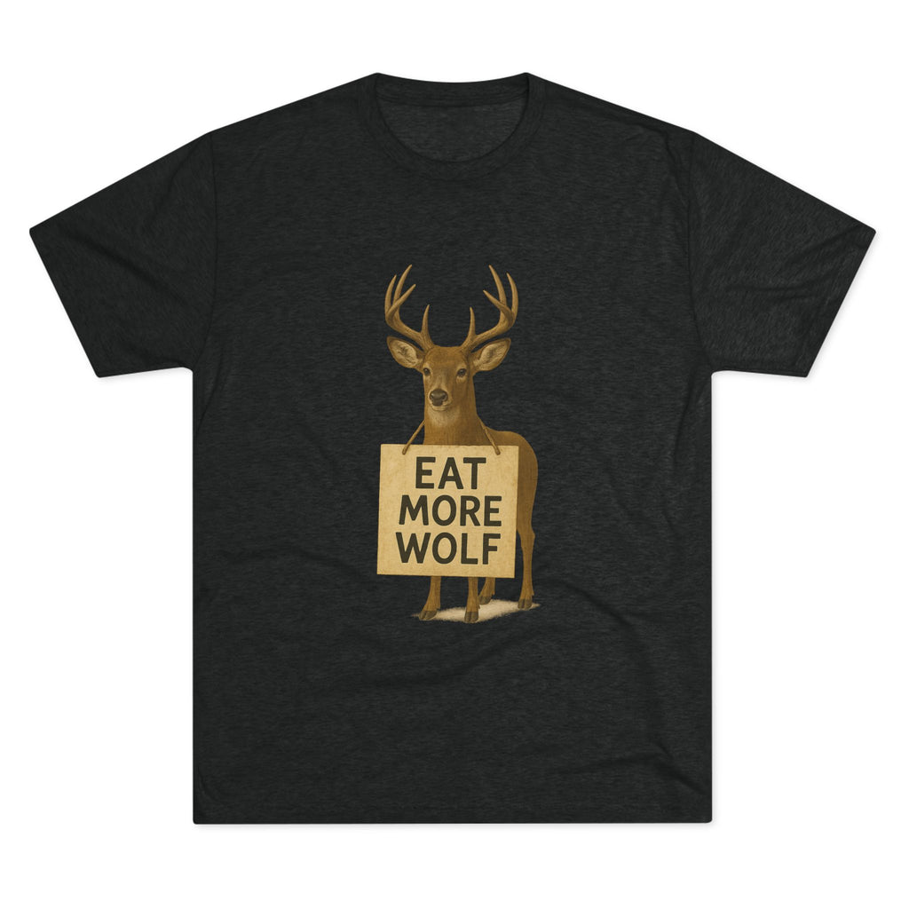 Lightweight tri-blend tee with a tongue-in-cheek outdoorsy design — a detailed buck holding a hand-lettered sign that reads “EAT MORE WOLF” on the front and bold, weathered text “FISH HUNT FOREVER” across the upper back. The muted, vintage palette and soft drape give it a lived-in look that layers easily under a flannel or wears solo on cool mornings. It reads like a quiet, ironic nod to woodslife humor: the kind of shirt you reach for when you’re heading to the lake, trading stories at camp, or slipping into the truck at dawn. Comfortable, breathable, and subtly rugged — it fits into outdoor routines without shouting, and it ages into a favorite worn-in piece.