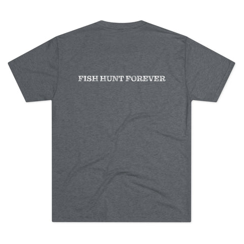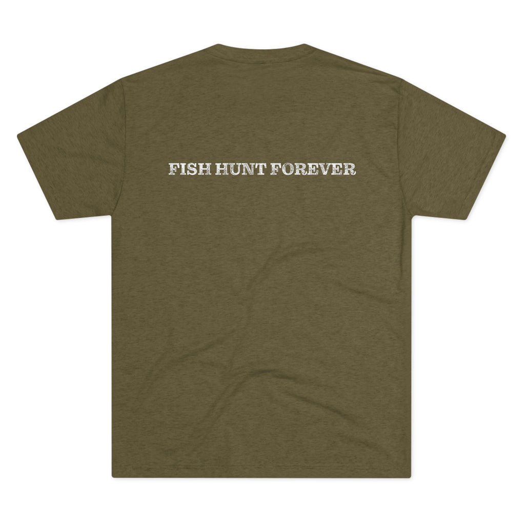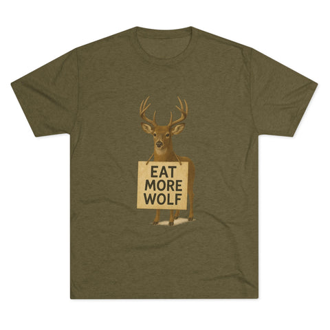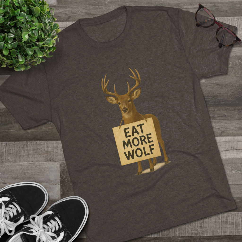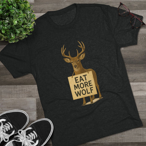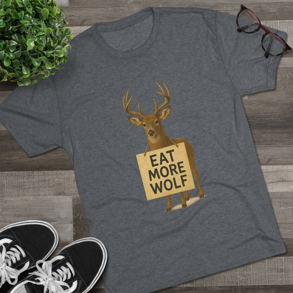 Lightweight tri-blend tee with a tongue-in-cheek outdoorsy design — a detailed buck holding a hand-lettered sign that reads “EAT MORE WOLF” on the front and bold, weathered text “FISH HUNT FOREVER” across the upper back. The muted, vintage palette and soft drape give it a lived-in look that layers easily under a flannel or wears solo on cool mornings. It reads like a quiet, ironic nod to woodslife humor: the kind of shirt you reach for when you’re heading to the lake, trading stories at camp, or slipping into the truck at dawn. Comfortable, breathable, and subtly rugged — it fits into outdoor routines without shouting, and it ages into a favorite worn-in piece.