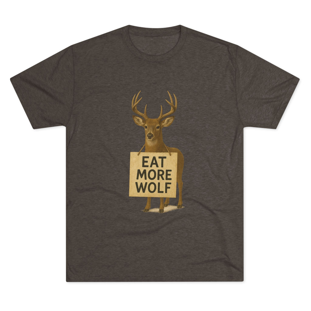 Deer Holding 'EAT MORE WOLF' Graphic Tee — 'FISH HUNT FOREVER' Back Print